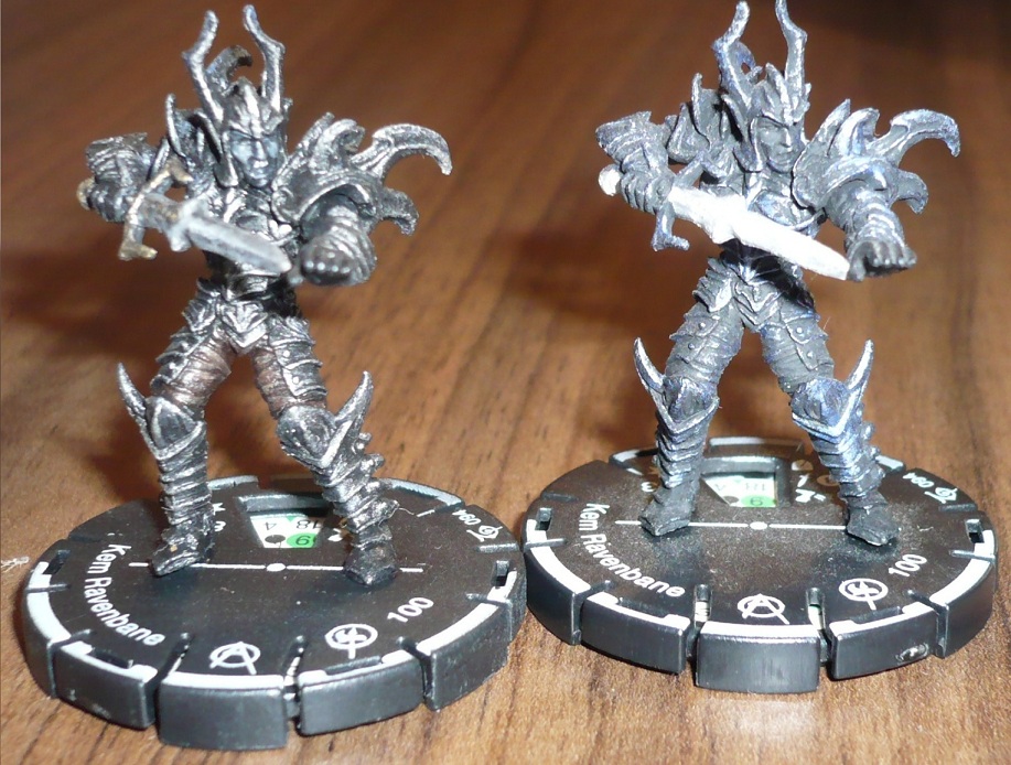 Hier ein Photo von der Kem Repaint. Großartig unterscheiden sie sich nicht, aber man sieht dass beim linken die highlights in bronze (?) statt in grau sind, das schwert ist in dünklerem silber und das Heft in Gold. Was man nicht sieht sind die Haare, die beim linken nicht weiß/grau sind sondern schwarz.